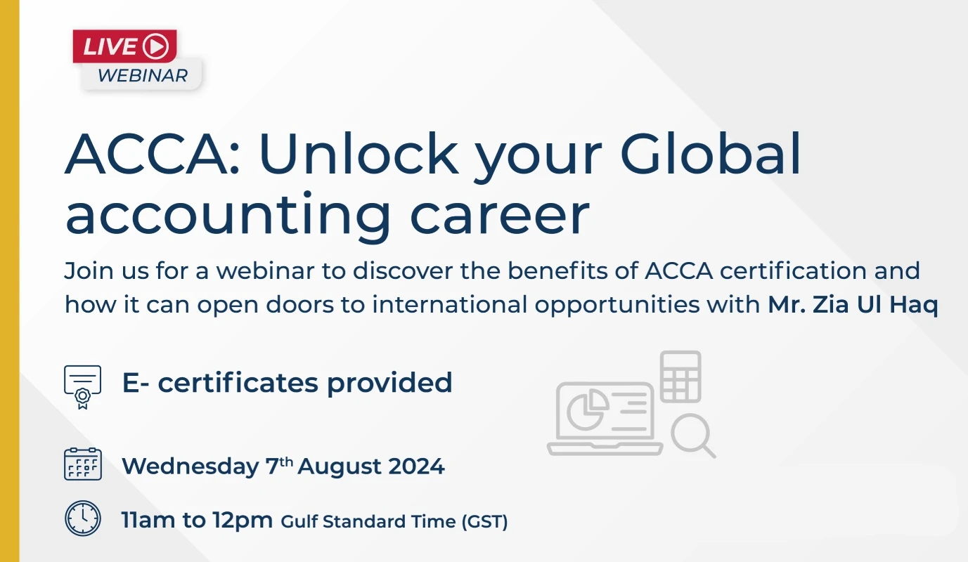 To help you explore the exciting opportunities offered by the ACCA course, we invite you to join our upcoming webinar on August 7, 2024, from 11 am to 12 pm (GST). This engaging session will be hosted on the Go To Webinar platform, making it easily accessible from anywhere.