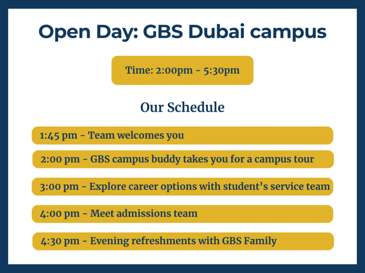 We look forward to seeing you join us enthusiastically and feel sure the Open Day at GBS Dubai will be the beginning of your transformative journey into higher education and beyond!