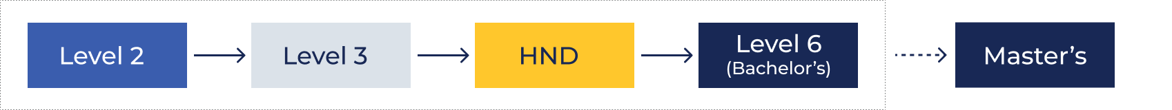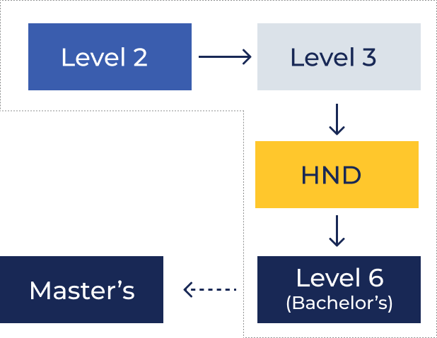 | Level 5 | Higher National Diploma (HND) | Second year of a UK bachelor’s degree |